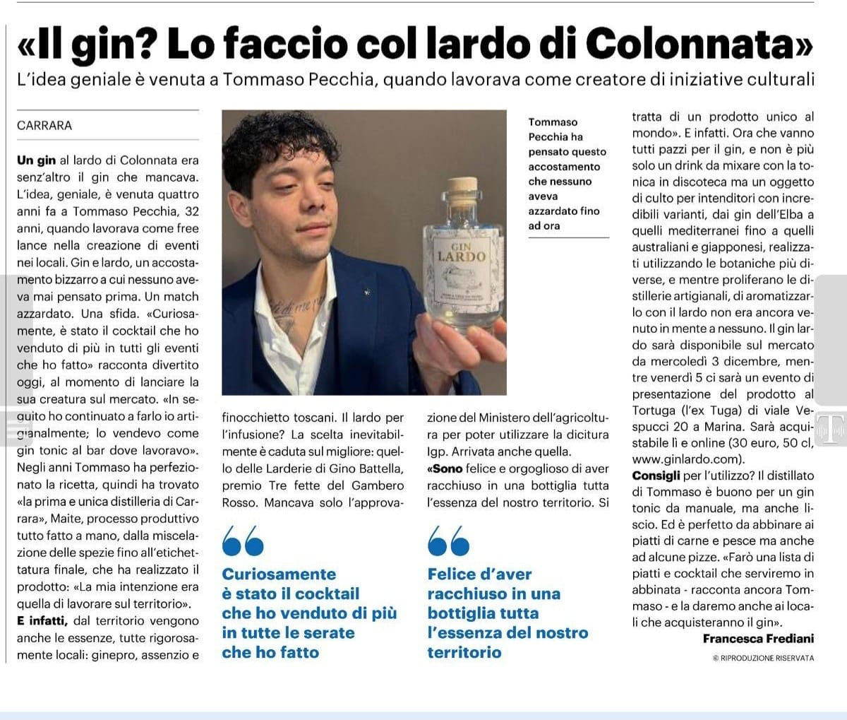 Gin Lardo è il primo e unico gin al mondo infuso con "Lardo di Colonnata IGP". Nasce nelle conche di marmo bianco di Carrara, con l'intento di stupire gli appassionati e raccontare, attraverso il gusto, l'essenza del territorio a cui è dedicato.